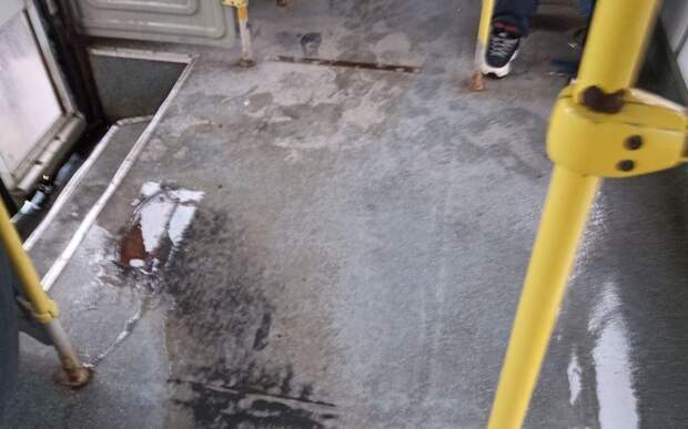 Кроме того, похожую проблему заметили в автобусе № 65. В задней части автобуса у двери видно, как людям приходится стоять в лужах.