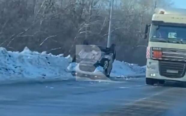 Авария произошла на Южной окружной дороге. Машина опрокинулась и оказалась на обочине.
