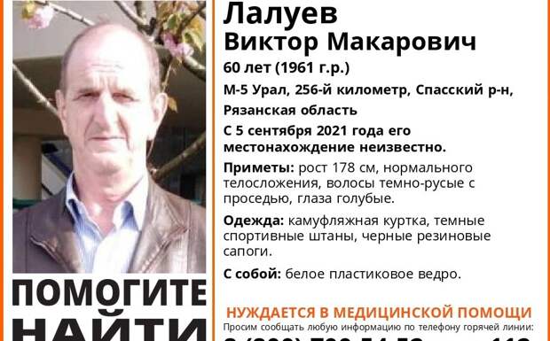 Ориентир поисков – 265-й километр дороги в районе. Виктор Лалуев был одет в камуфляжную куртку, тёмные штаны и черные резиновые сапоги. С собой у пенсионера белое пластиковое ведро.