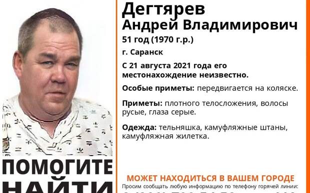 Андрей Дягтярев из Саранска пропал 21 августа 2021 года. Мужчина передвигается на коляске. Он плотного телосложения, у него русые волосы и серые глаза. В день пропажи был одет в тельняшку, камуфляжные штаны и камуфляжную жилетку.