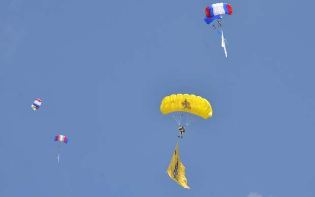 Завершилась церемония приземлением на поле парашютистов с флагами стран-конкурсанток и коллективным исполнением «Синевы».