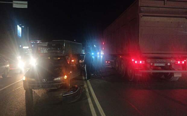 Авария произошла в четверг, 24 августа, примерно в 20:20. По информации источника портала, Mazda обгоняла фуру, а затем врезалась в неё и отлетела в Peugeot. Пострадавших нет.
