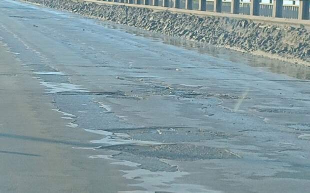 В очередной раз дорожных рабочих на мосту заметили 22 января - они в очередной раз пытались привести покрытие хоть в сколько-нибудь приличный вид. Однако ремонт продержался лишь неделю - на фото с моста 29 января вновь видны ямы.