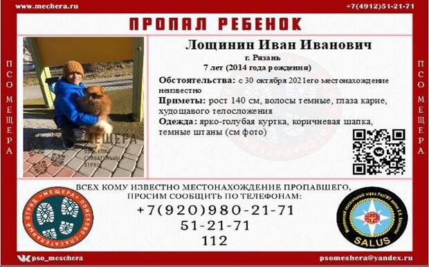 Мальчик пропал в субботу, 30 октября. Поисковики отмечают, что с этого дня местонахождение ребёнка неизвестно.