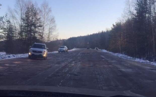 Проезжая часть разбита на протяжении примерно километра - это участок дороги у деревни Верещугино. На асфальте - глубокие ямы и глыбы льда, все это не позволяет безопасно двигаться со скоростью выше 20 км/ч. Водители пытаются объехать препятствия по обочинам.