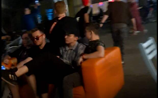 На кадрах видно, что несколько молодых людей тащат диван с помощью специального приспособления, в то время, как ещё несколько сидят на нём. Таким образом, рязанцы передвигались по улице Почтовой.