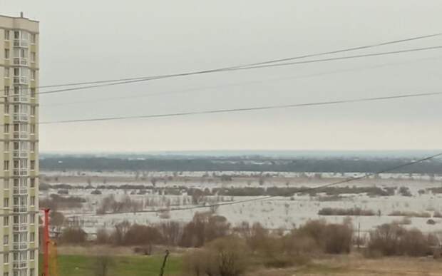 На кадрах видно часть деревьев и другой растительности, погружённых в воду. Половодье может дойти до строительных площадок, где возводят многоэтажки.